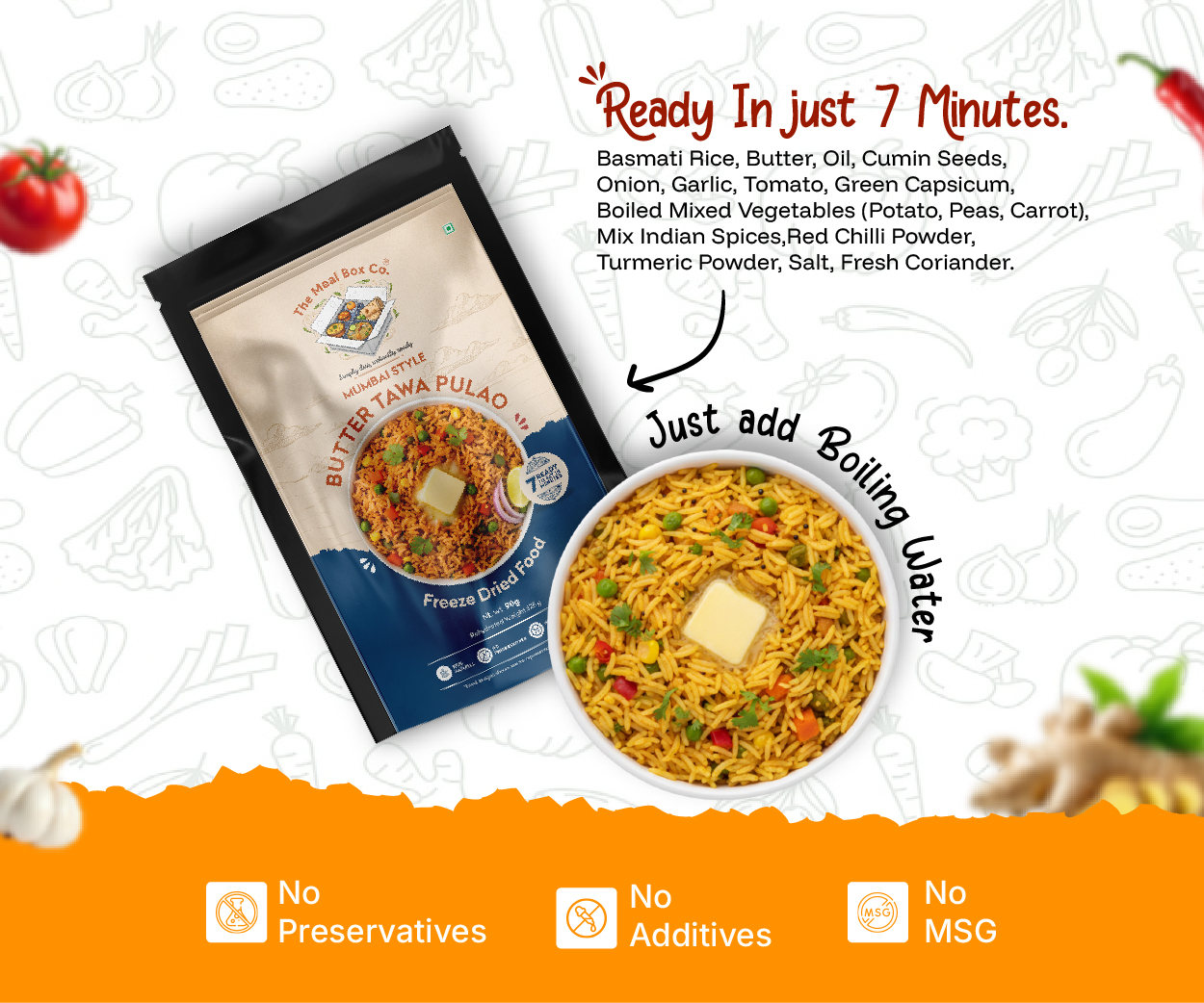Basmati Rice, Butter, Oil, Cumin Seeds, Onion, Garlic, Tomato, Green Capsicum, Boiled Mixed Vegetables (Potato, Peas, Carrot), Mix Indian Spices, Red Chilli Powder, Turmeric Powder, Salt, Fresh Coriander.