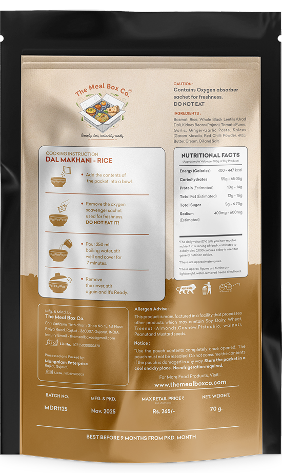 Basmati Rice, Whole Black Lentils (Urad Dal), Kidney Beans (Rajma), Tomato Puree, Garlic, Ginger-Garlic Paste, Spices (Garam Masala, Red Chilli Powder, etc.), Butter, Cream, Oil and Salt.