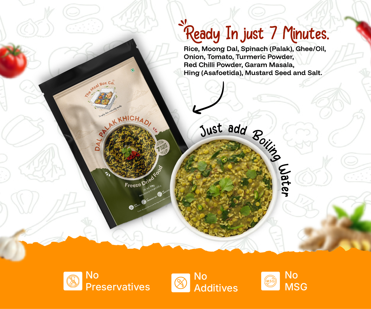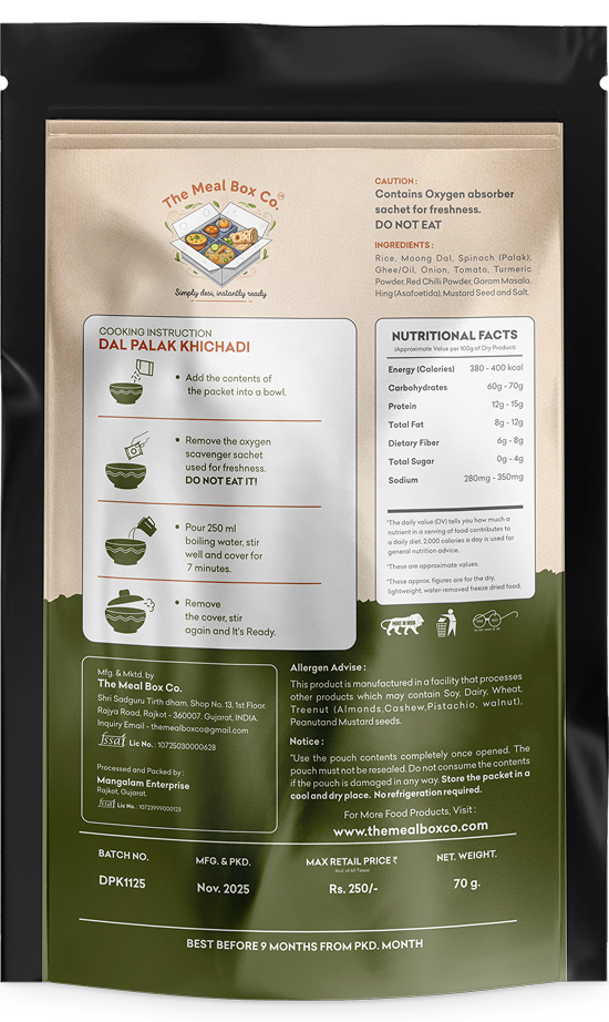 Rice, Moong Dal, Spinach (Palak), Ghee/Oil, Onion, Tomato, Turmeric Powder, Red Chilli Powder, Garam Masala, Hing (Asafoetida), Mustard Seed and Salt.