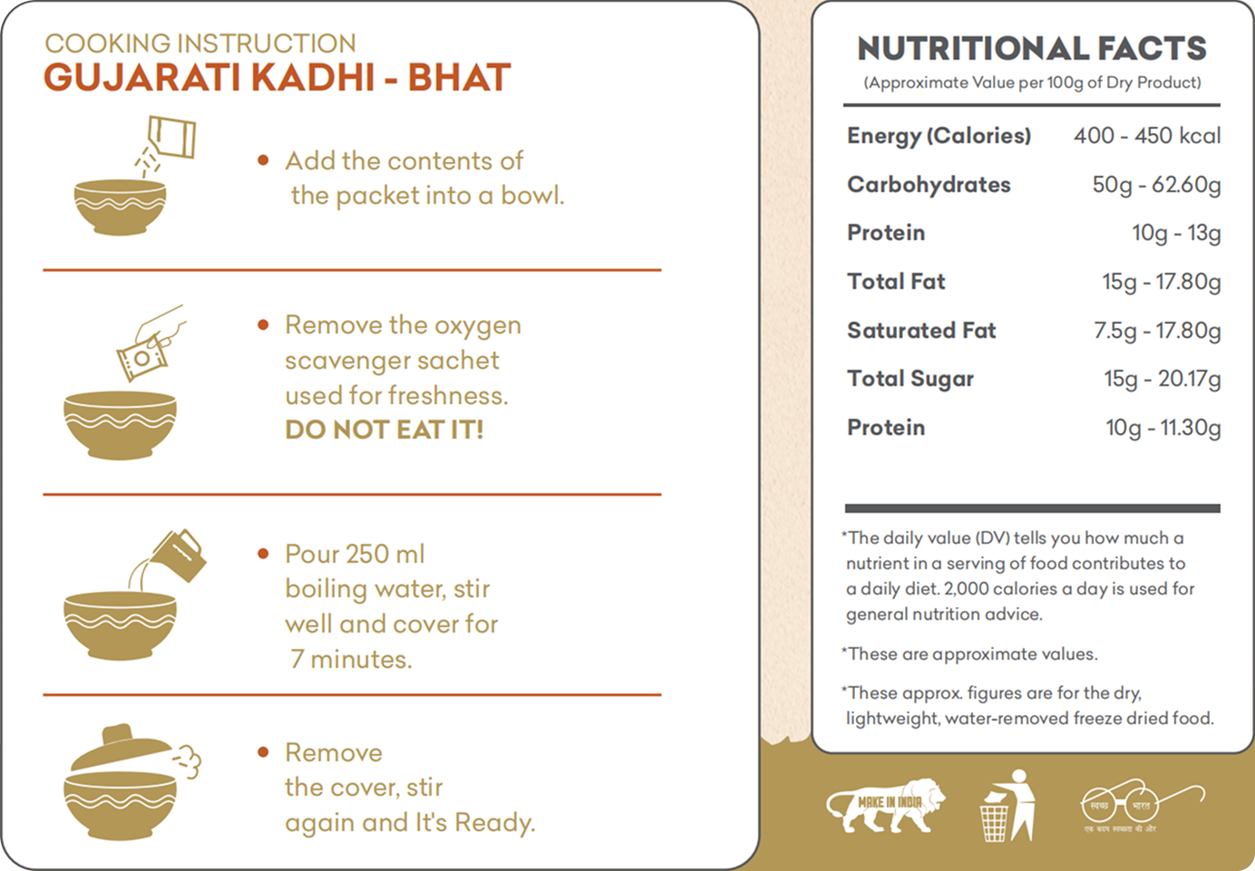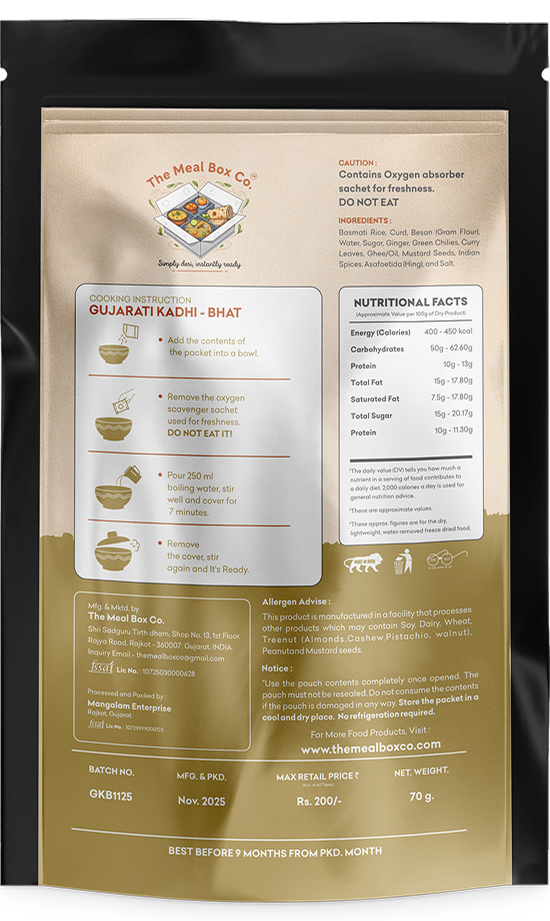 Basmati Rice, Curd, Besan (Gram Flour), Water, Sugar, Ginger, Green Chilies, Curry Leaves, Ghee/Oil, Mustard Seeds, Indian Spices, Asafoetida (Hing), and Salt.