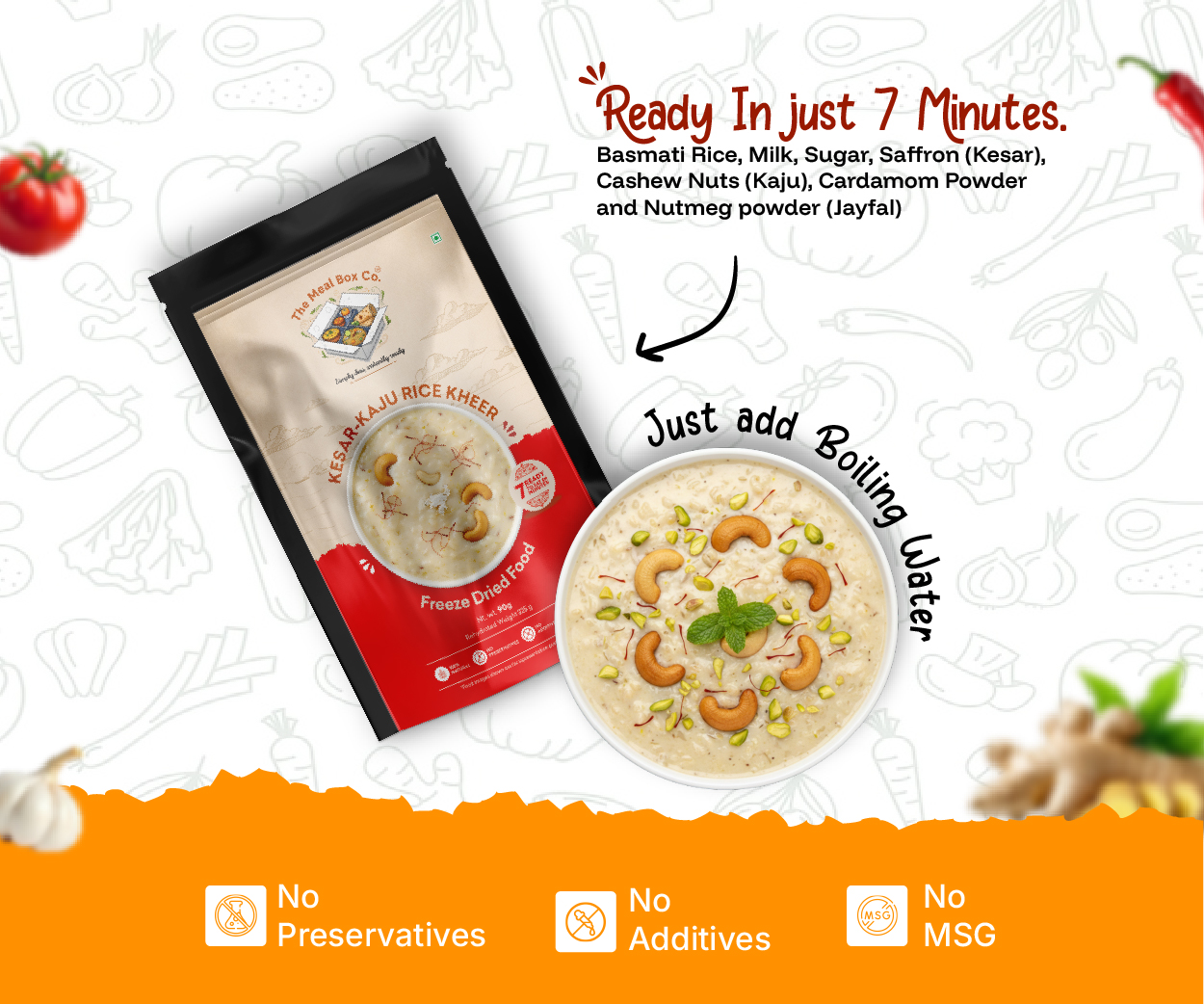 Basmati Rice, Milk, Sugar, Saffron (Kesar), Cashew Nuts (Kaju), Cardamom Powder and Nutmeg powder (Jayfal)