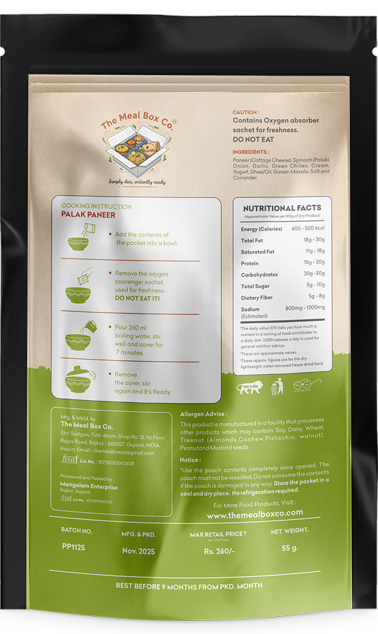 Paneer (Cottage Cheese), Spinach (Palak), Onion, Garlic, Green Chilies, Cream, Yogurt, Ghee/Oil, Garam Masala, Salt and Coriander.