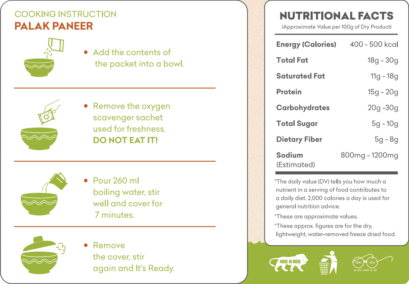 | Energy (Calories) | 400 kcal – 500 kcal |