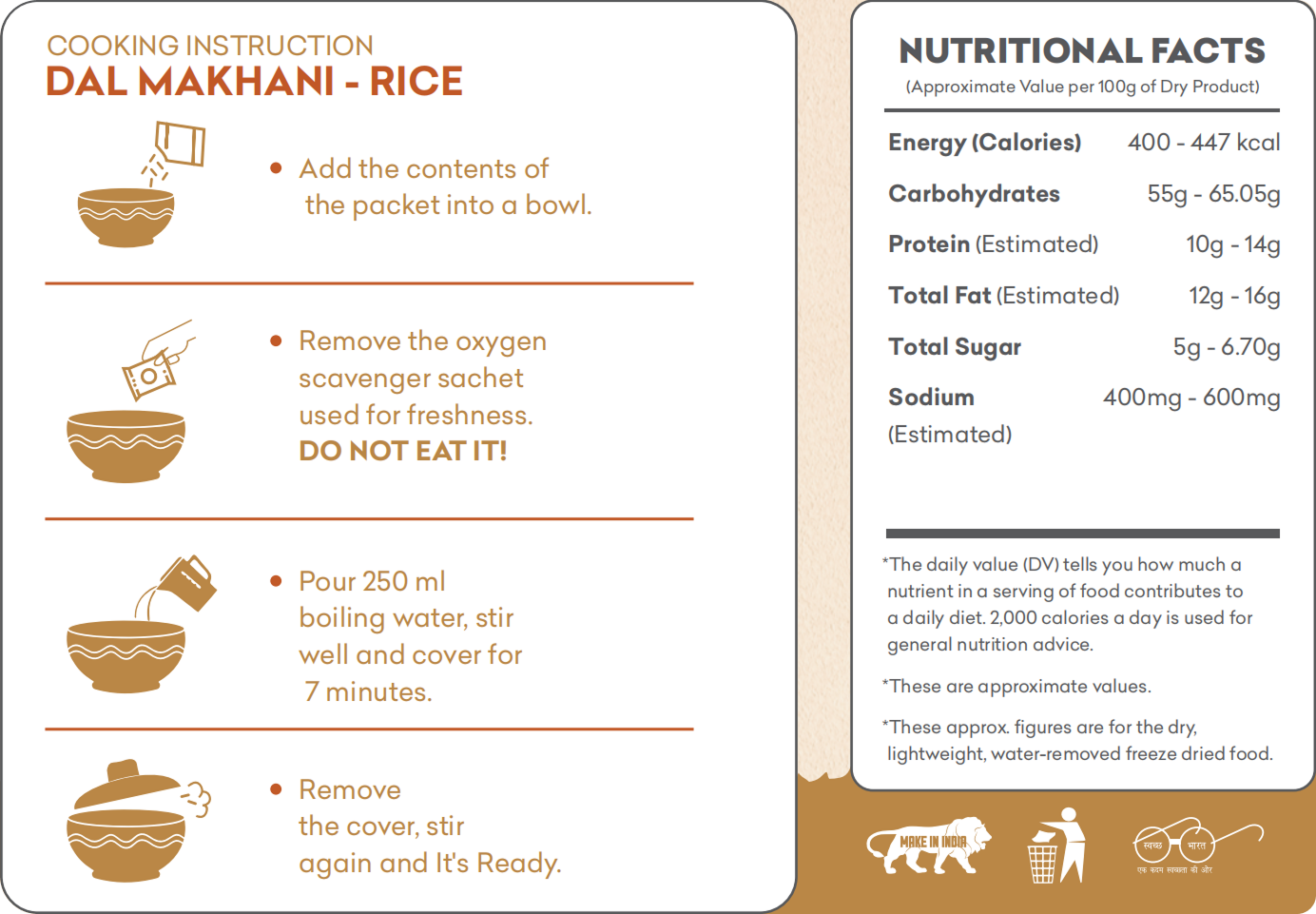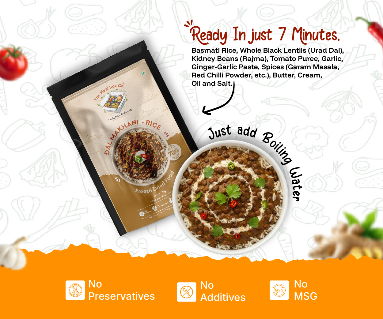 Basmati Rice, Whole Black Lentils (Urad Dal), Kidney Beans (Rajma), Tomato Puree, Garlic, Ginger-Garlic Paste, Spices (Garam Masala, Red Chilli Powder, etc.), Butter, Cream, Oil and Salt.