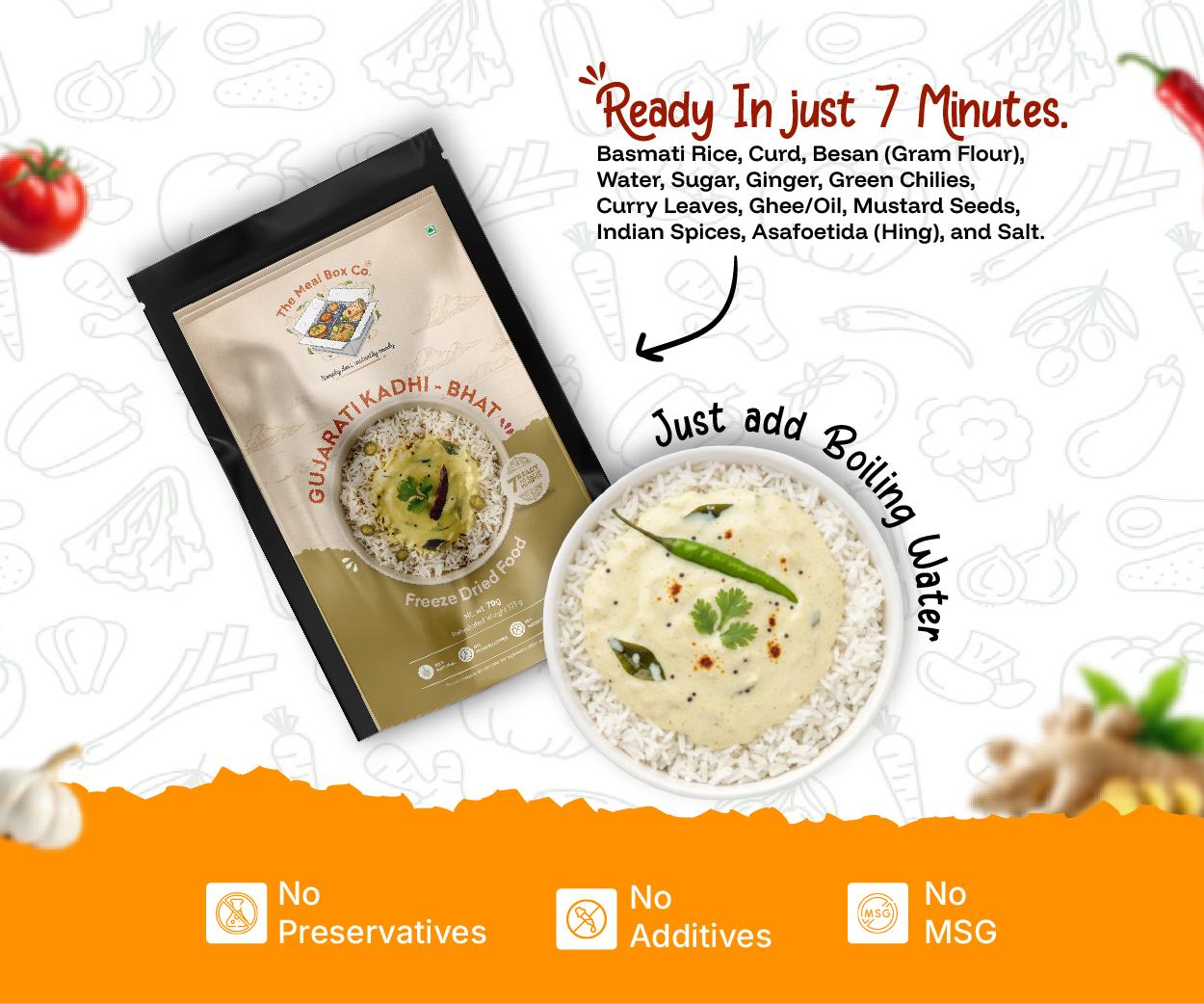 Basmati Rice, Curd, Besan (Gram Flour), Water, Sugar, Ginger, Green Chilies, Curry Leaves, Ghee/Oil, Mustard Seeds, Indian Spices, Asafoetida (Hing), and Salt.