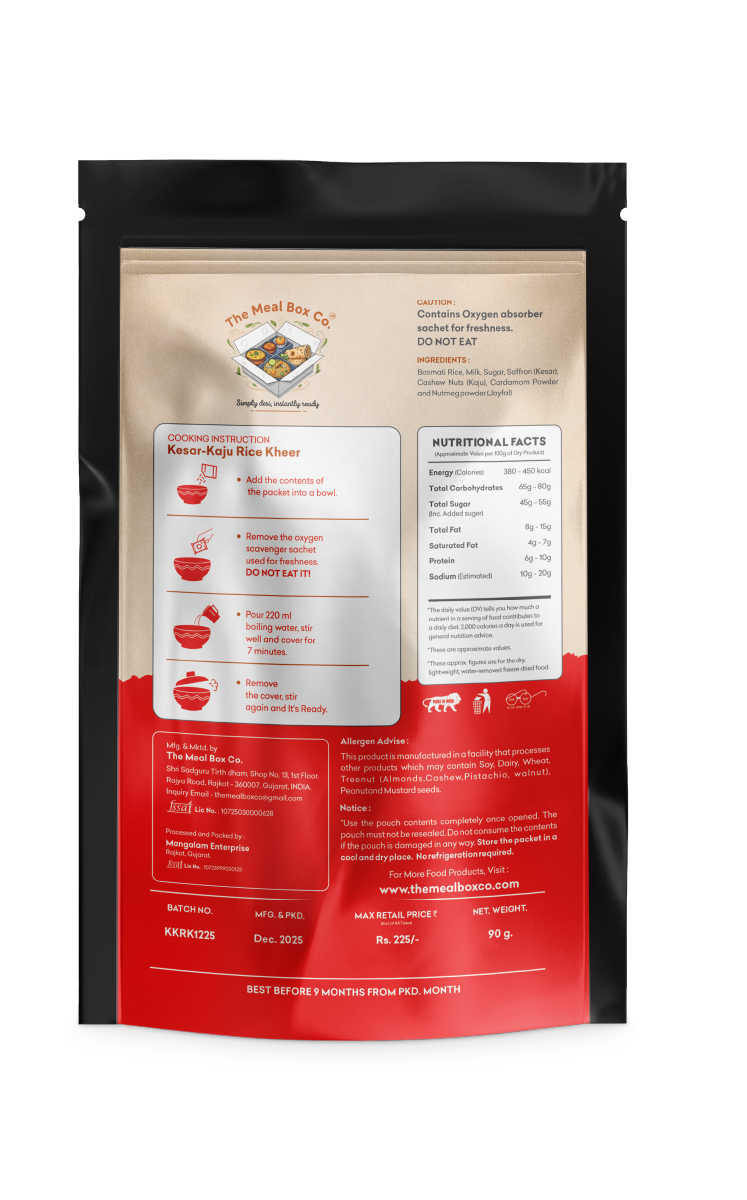 Basmati Rice, Milk, Sugar, Saffron (Kesar), Cashew Nuts (Kaju), Cardamom Powder and Nutmeg powder (Jayfal)