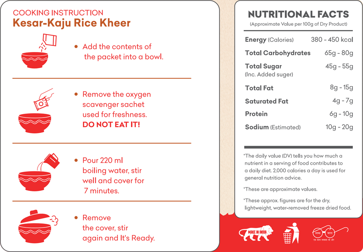 | (Approximate Value per 100g for Freeze Dried Kesar-Kaju Rice Kheer) | |